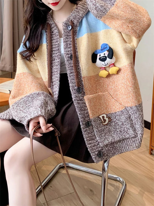 Women's Color Block Hooded Cardigan with Cute Plush Dog - Kawaii Oversized Knit Coat