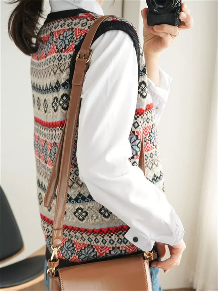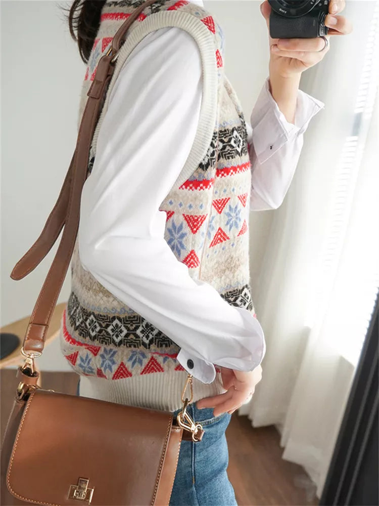 Mit dieser Strickweste im Vintage-Stil der 90er mit geometrischem Muster gelingt Ihnen der perfekte Preppy-Academia-Look. Weich, kuschelig und ideal zum stylischen Layering – dieser ärmellose Pullover ist Ihr neues Lieblingsstück für einen schicken Retro-Stil.