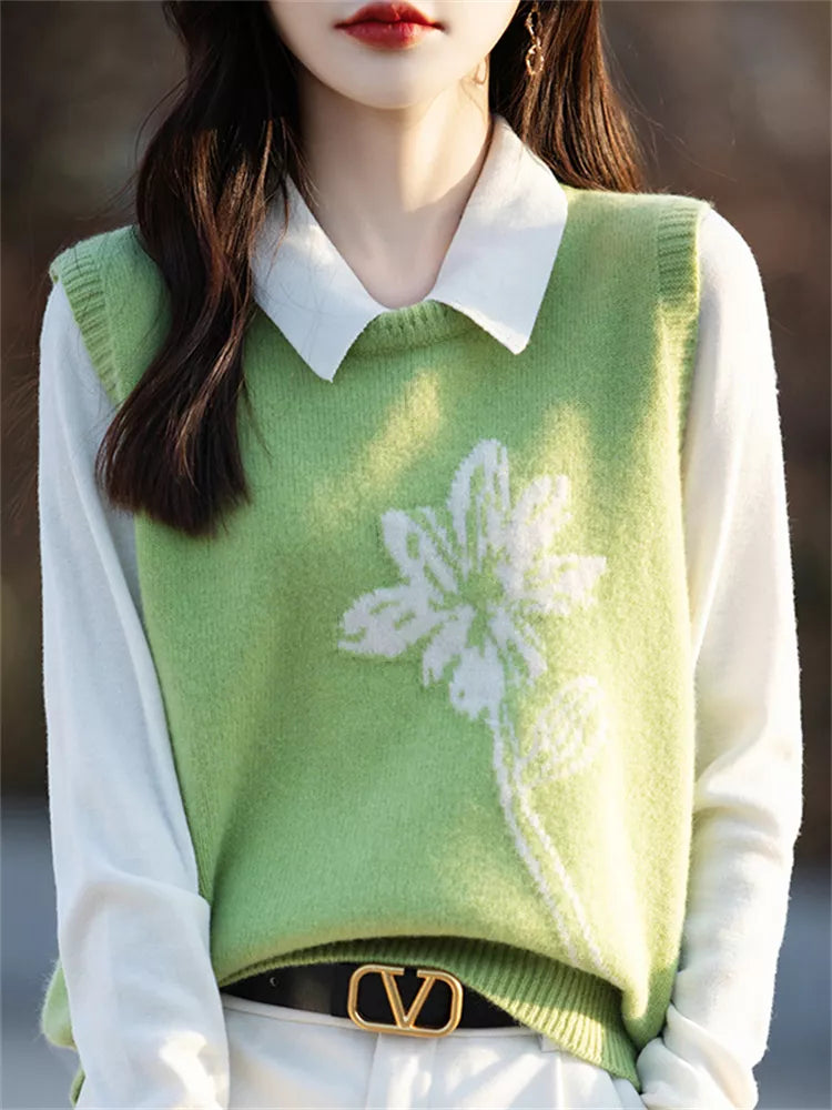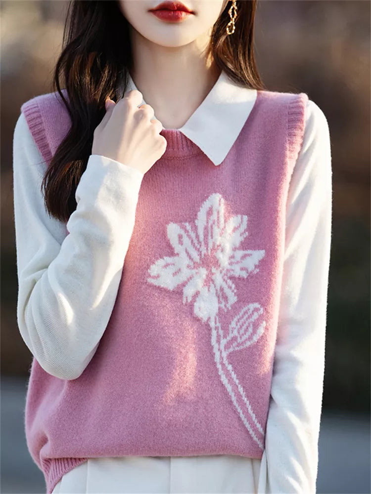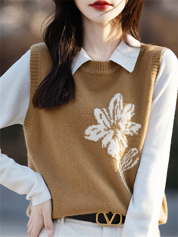Damen-Strickweste mit Blumenmuster | Lässige, ärmellose Rundhals-Strickweste vereint lässigen Tragekomfort mit einem Hauch Retro-Charme. Die Weste mit zarten Blumenmustern und lockerer Silhouette bietet ein weiches und atmungsaktives Material und eignet sich perfekt zum Tragen über Blusen oder Kleidern. Ideal für mühelos schicke Looks zu jeder Jahreszeit. ❤️