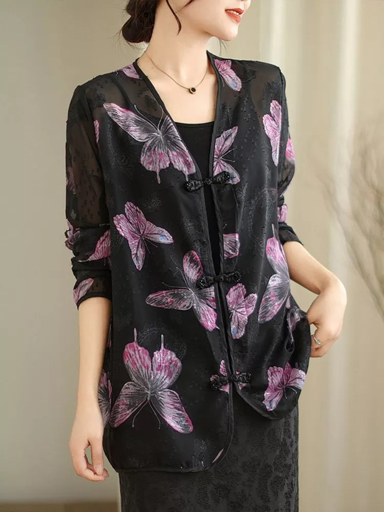Schwarze Bluse mit V-Ausschnitt und Froschknopfleiste für Damen | Elegantes Vintage-Top im chinesischen Stil vereint zeitlose Eleganz mit orientalischem Flair. Die Bluse besticht durch zarte Froschknopfleisten, einen schmeichelhaften V-Ausschnitt und raffinierte Blumenmuster auf weichem, fließendem Stoff. Perfekt zu Röcken oder eleganten Hosen – diese Bluse versprüht einen charmanten Vintage-Flair und ist ideal für Alltag und besondere Anlässe. ❤️