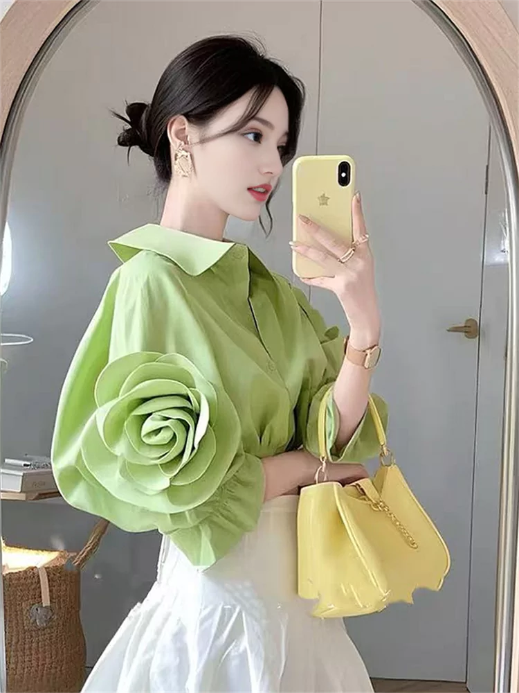 Dieses elegante, hochwertige grüne Kurzarmhemd mit 3D-Blumenmuster für Damen vereint moderne Eleganz mit einzigartiger Handwerkskunst. Die detailreiche 3D-Blumenapplikation verleiht diesem außergewöhnlichen Kurzarmhemd Ihrer Garderobe eine raffinierte, künstlerische Note – perfekt für lässig-elegante Looks oder besondere Anlässe. ❤️