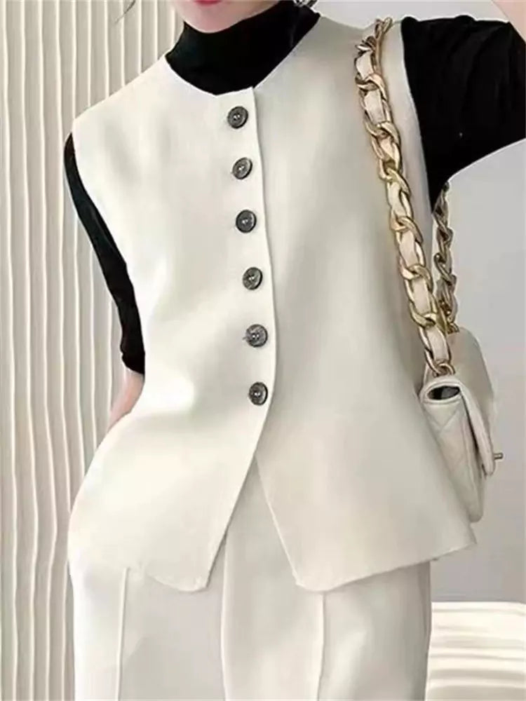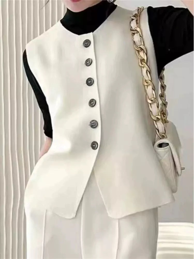 Elegante, taillierte Weste aus weißer Wolle für Damen – ärmellos, schmal geschnitten, Rundhalsausschnitt