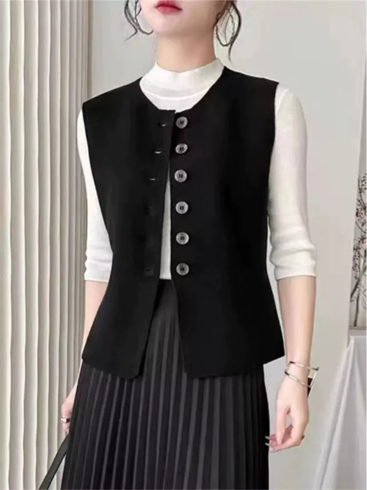 Elegante, taillierte Strickweste aus Wolle für Damen – ärmellos, schmal geschnitten, mit Rundhalsausschnitt. Diese Weste vereint Eleganz mit moderner Vielseitigkeit. Gefertigt aus feiner Wolle, besticht dieses leichte, ärmellose Modell durch seinen schmeichelhaften, figurbetonten Schnitt und die Knopfleiste. Ideal zum Kombinieren im Frühling und Herbst. ❤️