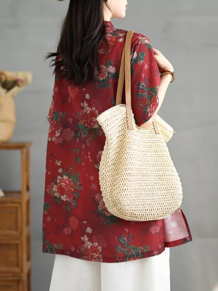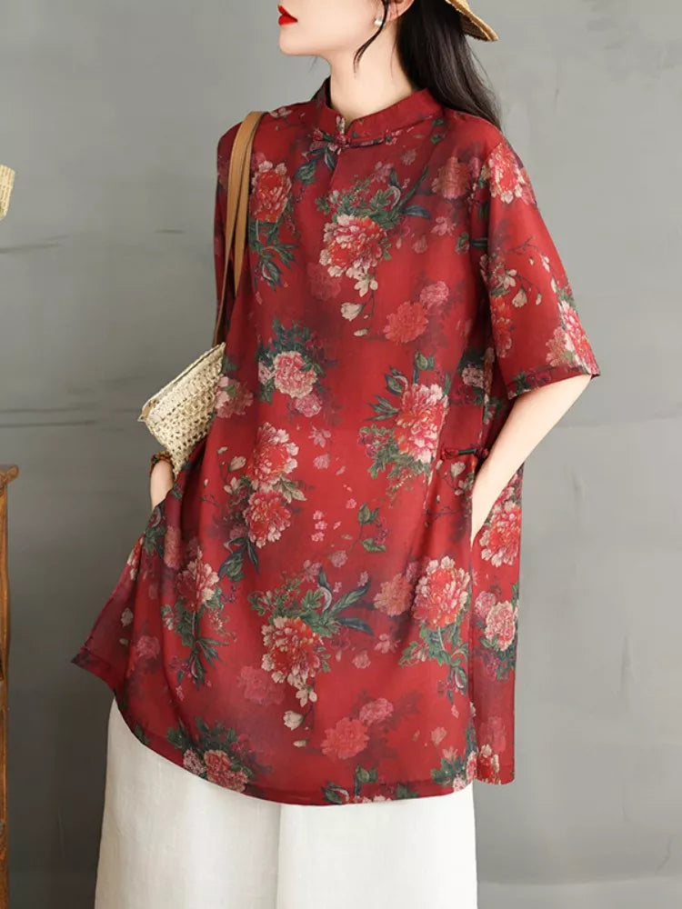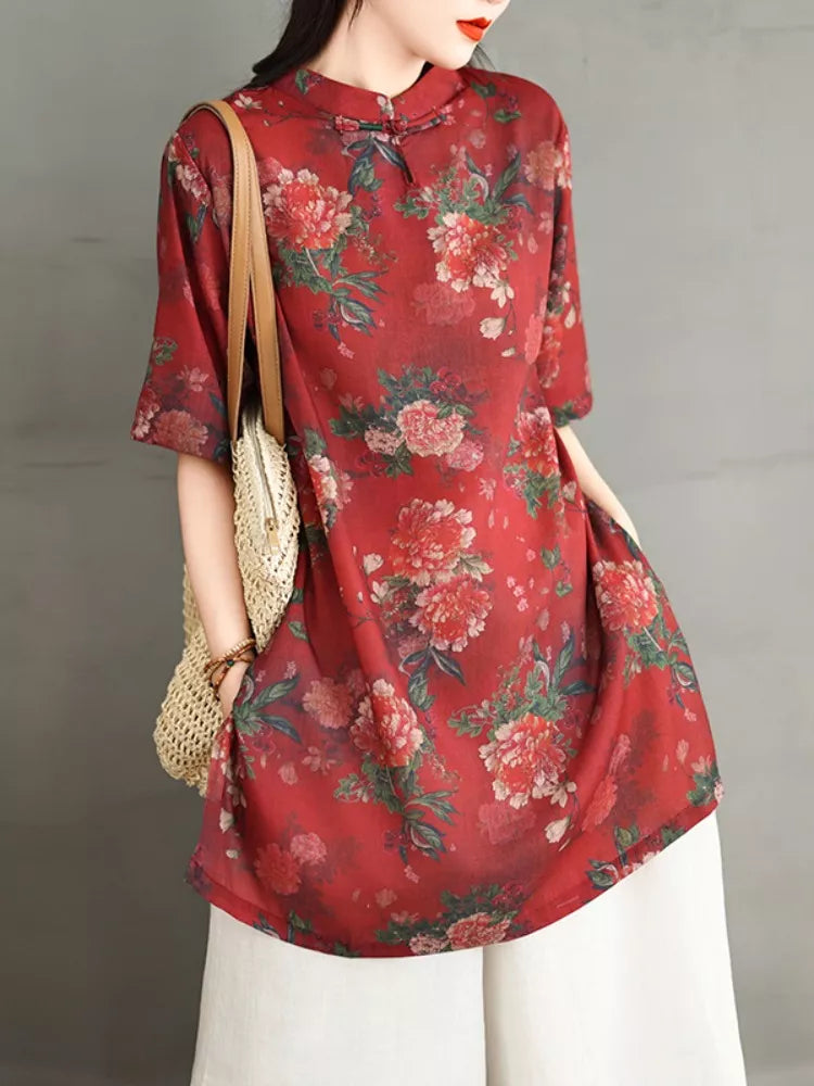 Damenbluse aus Baumwoll-Leinen-Mischgewebe mit rotem Pfingstrosenmuster im chinesischen Stil