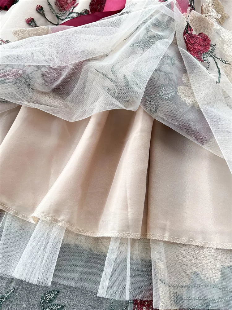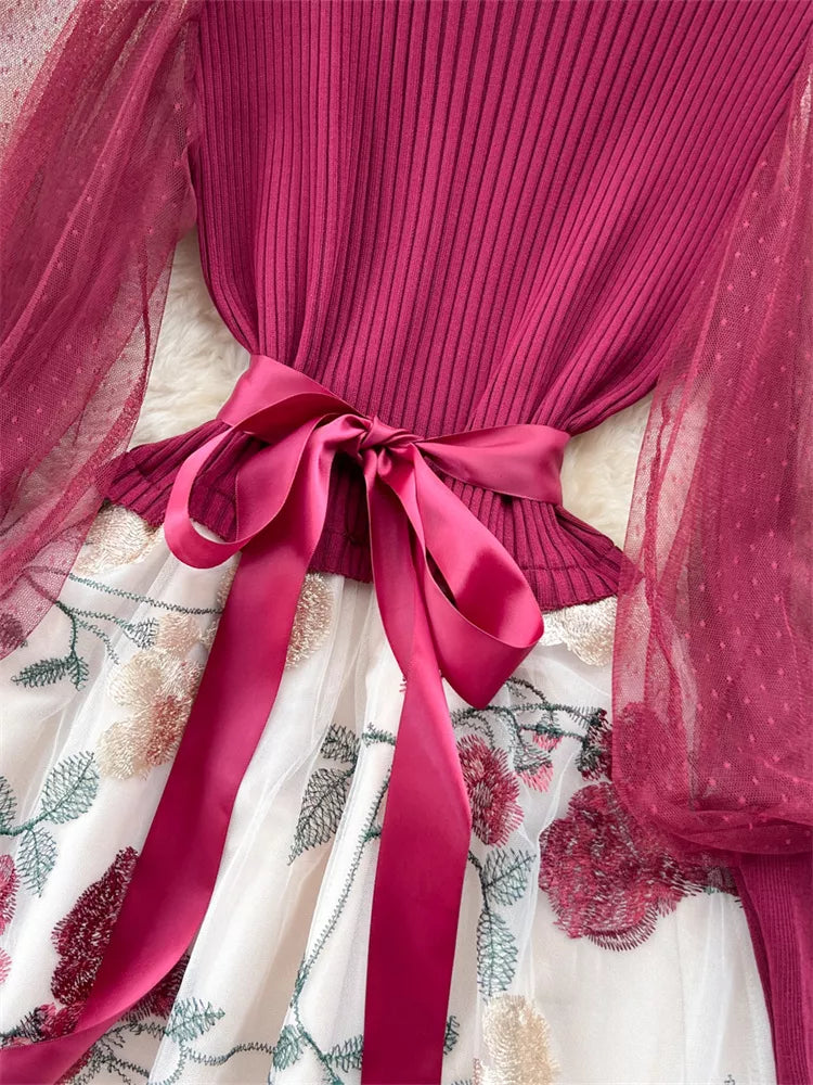 Elegant French Style Knitted Spliced Floral Mesh Dress perfectly captures the essence of "light luxury" socialite fashion. This stunning one-piece features a slimming ribbed knit bodice in a rich burgundy hue, seamlessly blended with romantic sheer puff sleeves and a voluminous tulle skirt. Adorned with exquisite floral embroidery and finished with a satin ribbon waist tie, this dress creates a flattering hourglass silhouette ideal for weddings, evening parties, or upscale events.