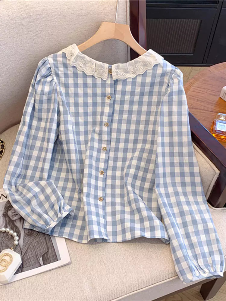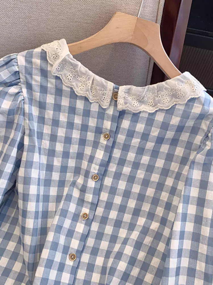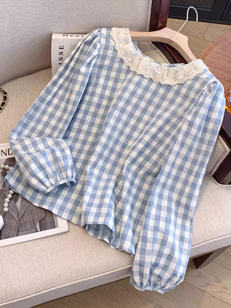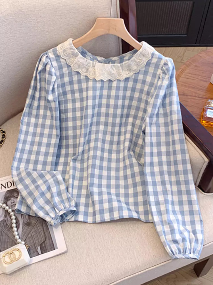 Dieses langärmlige Hemd im französischen Karostil mit Spitzenbesatz für Damen vereint klassischen Karo-Charme mit zarten, femininen Details. Mit elegantem Spitzenbesatz und einer verspielten Silhouette bietet dieses Hemd einen schicken und vielseitigen Look, der sich perfekt für Freizeit, Büro oder romantische Streetwear eignet. ❤️