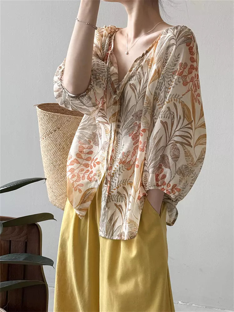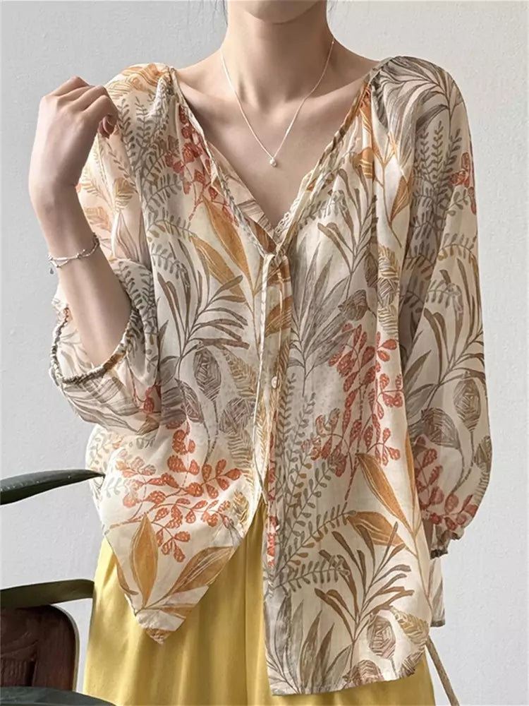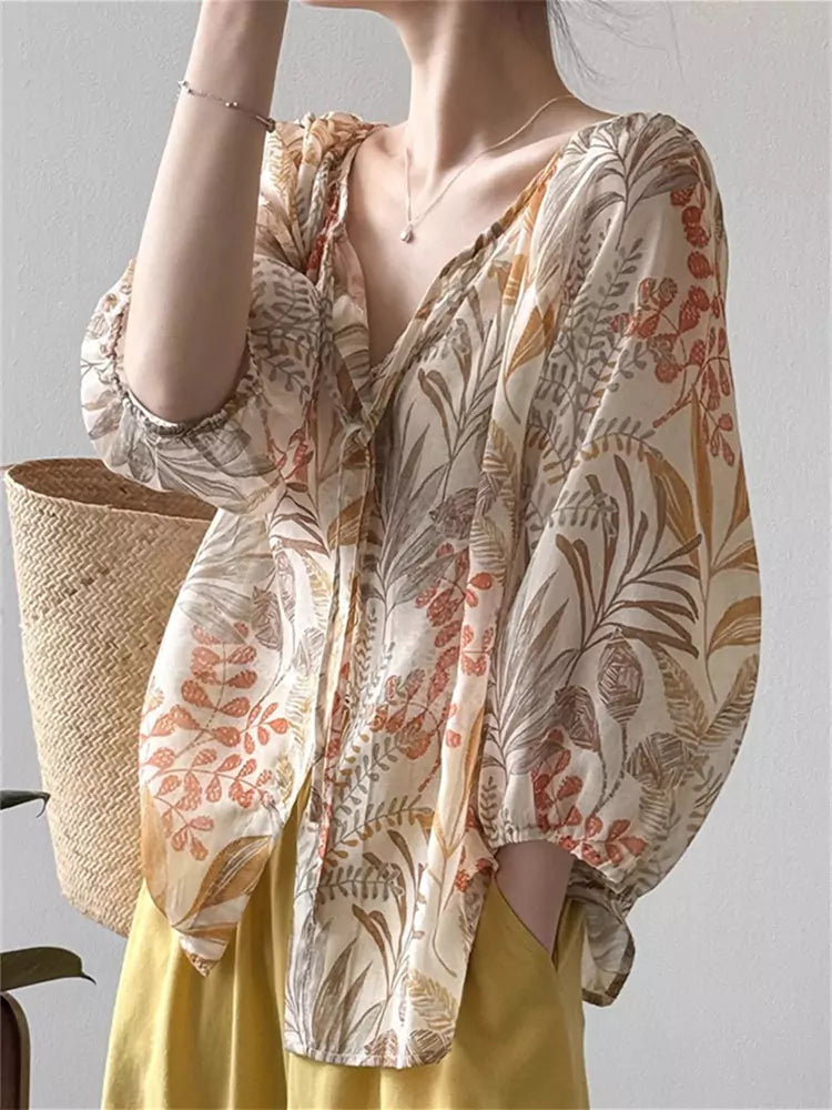 Französische Chiffonbluse mit V-Ausschnitt, Bindeband vorne und Blumenmuster – lockere Passform und Dreiviertelärmel vereinen romantische Eleganz mit luftigem Tragekomfort. Die fließende Bluse aus leichtem Chiffon besticht durch ein zartes Blumenmuster, einen schmeichelhaften V-Ausschnitt mit Bindeband und eine bequeme Passform – perfekt für legere oder festliche Anlässe im Frühling und Sommer. ❤️