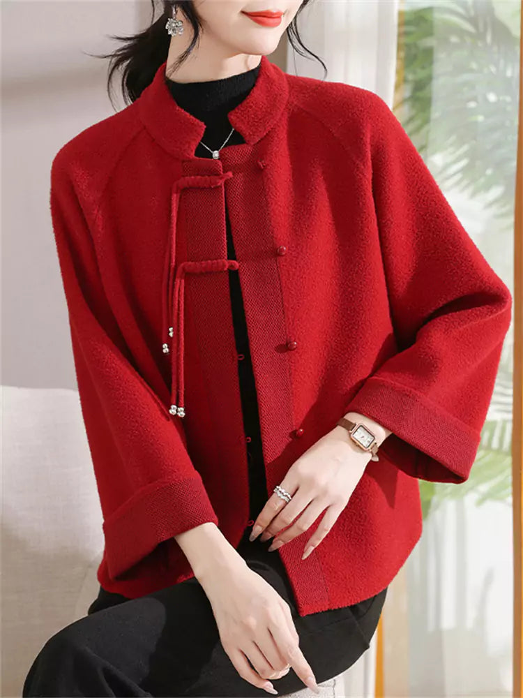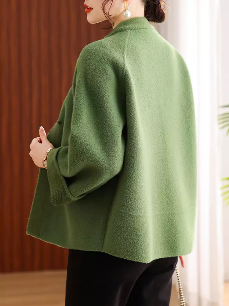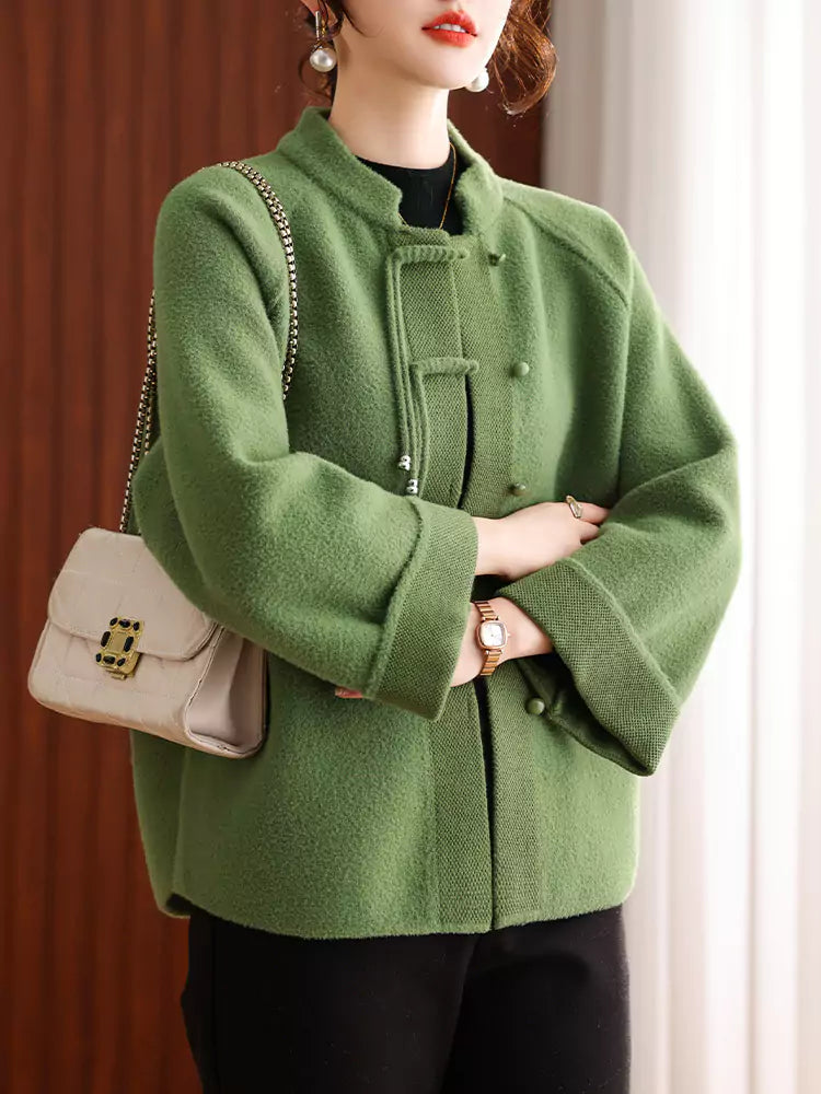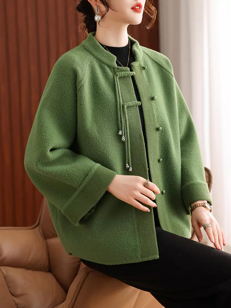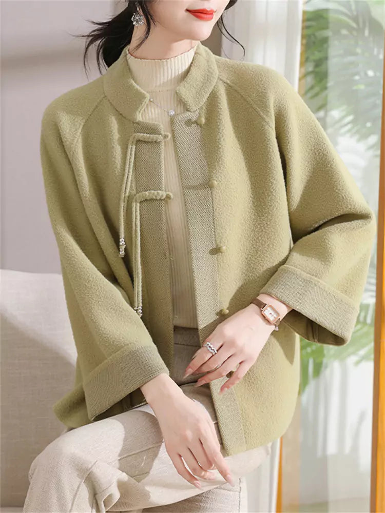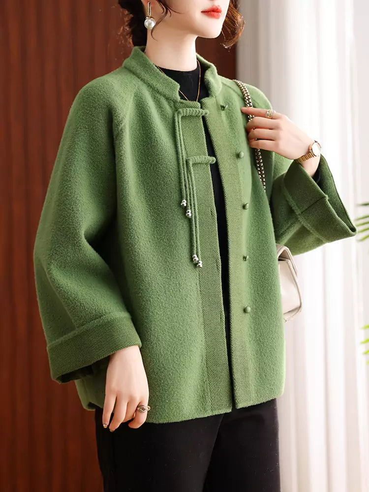 Grüner Stehkragenmantel mit Mandarin-Knöpfen für Damen | Lässiger Schnitt mit überschnittenen Schultern im chinesischen Stil . Dieser Mantel vereint traditionelle chinesische Eleganz mit modernem Tragekomfort. Gefertigt aus einem weichen Wollmischgewebe, besticht er durch einen Stehkragen mit klassischen Mandarin-Knöpfen, ein lockeres Design mit überschnittenen Schultern und vielseitige Stylingmöglichkeiten. Er eignet sich perfekt zum Kombinieren mit legeren oder semi-formellen Outfits in Herbst und Winter. ❤️