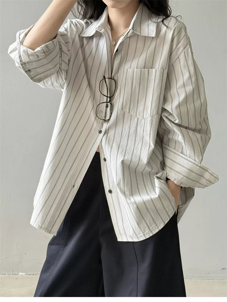 Marineblau gestreiftes Oversize-Langhemd für Damen | Lässige, locker sitzende Langarmbluse mit Knopfleiste für jeden Tag – für mühelose Eleganz in Ihrer Garderobe. Die vertikalen marineblauen Streifen sorgen für eine schlankmachende Silhouette. Das lockere Oversize-Hemd fällt fließend und bietet hohen Tragekomfort. Perfekt zum Layern über T-Shirts oder in Kombination mit Jeans oder Leggings für einen modernen, lässigen Look. ❤️