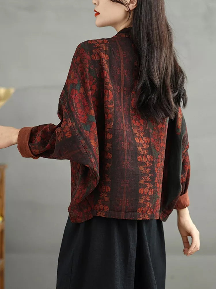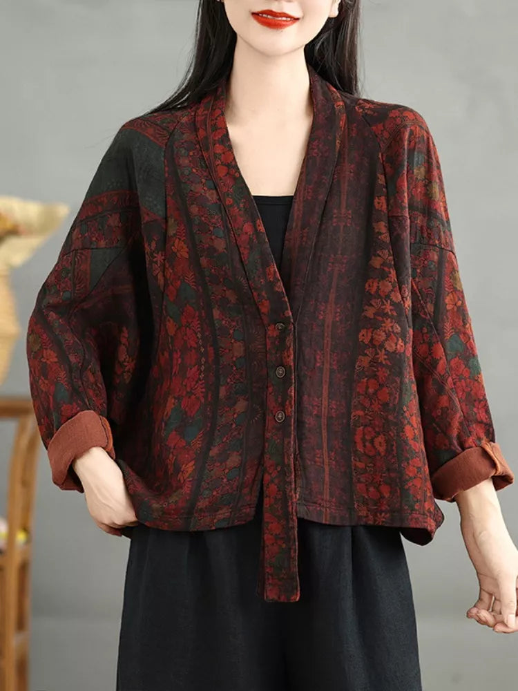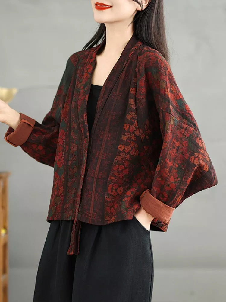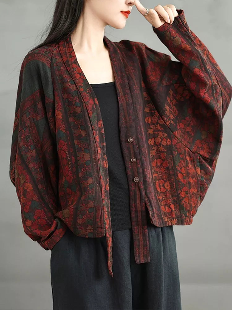 Kurze, locker geschnittene Damenjacke aus Baumwoll-Leinen-Mischgewebe mit Fledermausärmeln und V-Ausschnitt | Lässige, Vintage-inspirierte Jacke für Frühling und Herbst vereint künstlerisches Flair mit hohem Tragekomfort. Die Jacke aus atmungsaktivem Baumwoll-Leinen-Mischgewebe besticht durch ihre lässigen Fledermausärmel, den schmeichelhaften V-Ausschnitt und den einzigartigen Vintage-Print. Dank ihrer lockeren Silhouette lässt sie sich perfekt über Kleidern oder Tops tragen und verleiht jedem Outfit einen raffinierten Boho-Charme. ❤️
