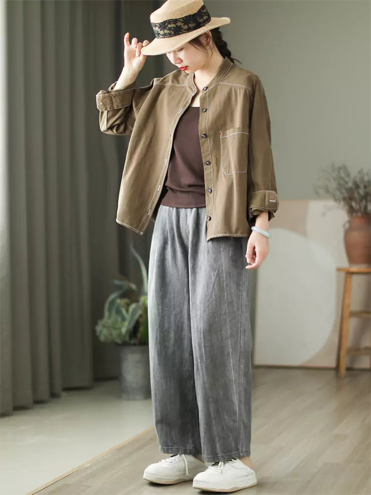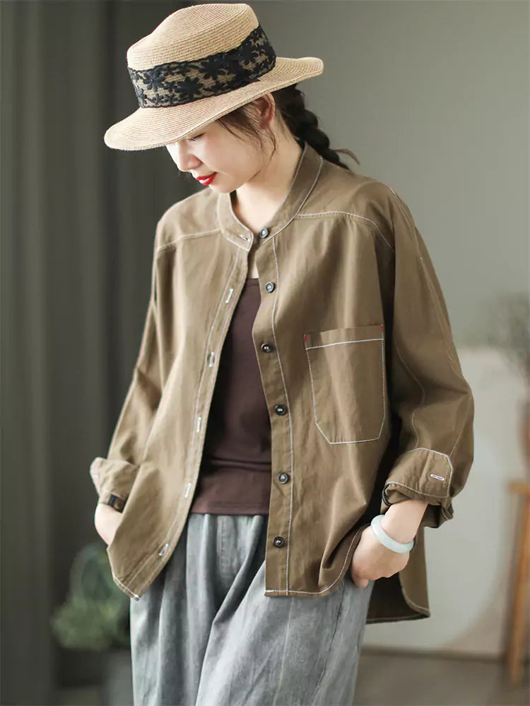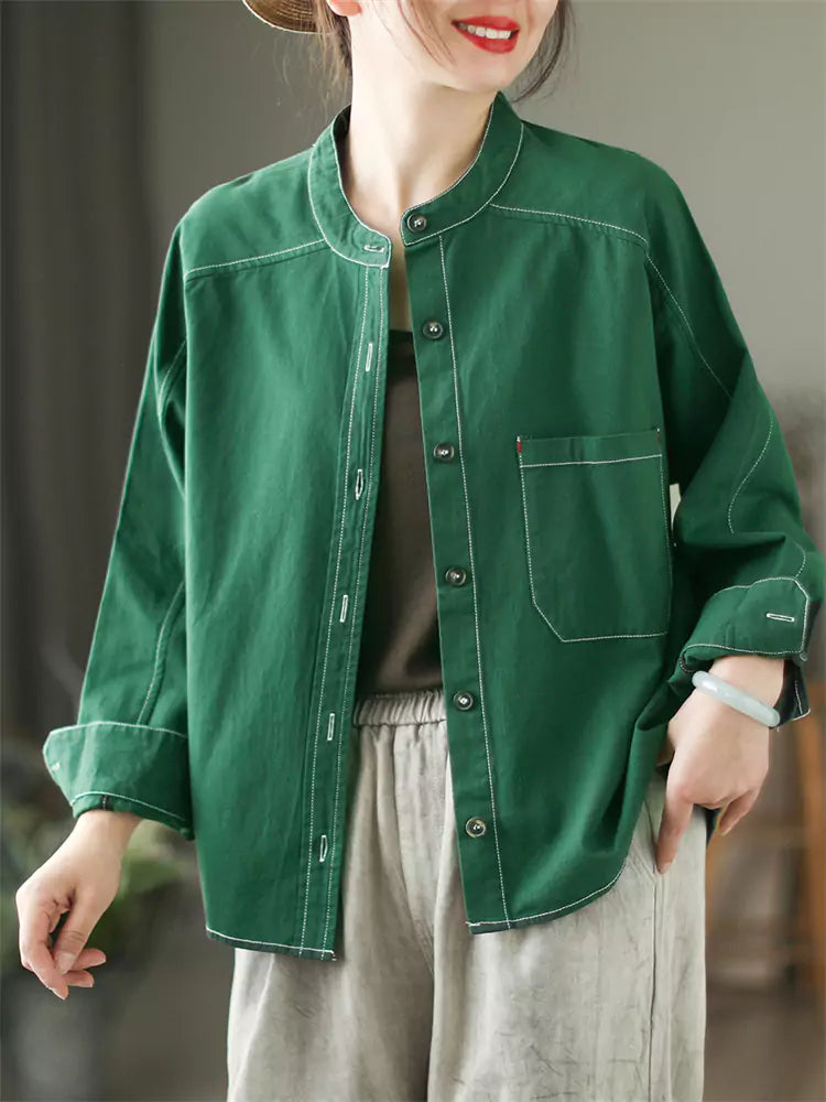 Vintage-grünes, langärmeliges, locker sitzendes Baumwollhemd mit Kontrastnähten und kontrastierenden Ziernähten für Damen