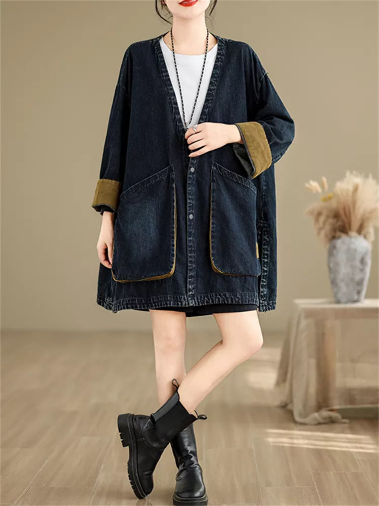 Vintage Jeansmantel mit V-Ausschnitt und großen Taschen für Damen