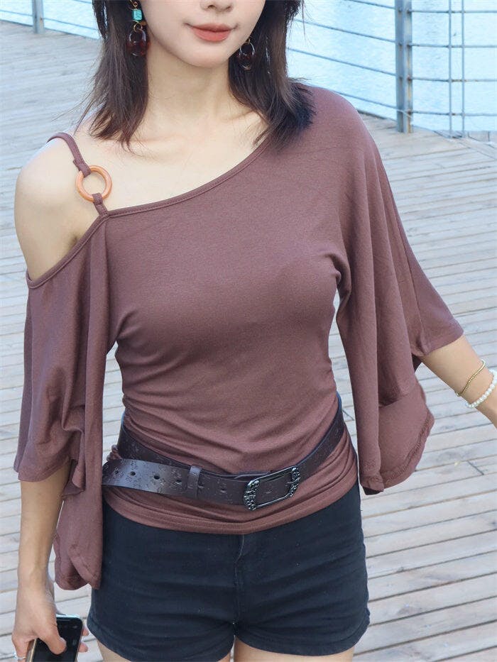 Women's Chocolate Brown Asymmetrical One-Shoulder Ruched Top with Ring Detail brings a chic, bohemian edge to your wardrobe. Featuring a unique shoulder strap embellished with wooden-style rings and beads, this top stands out with its flared bell sleeves and flattering gathered waist. The rich chocolate color and slimming ruched silhouette make it a versatile piece that perfectly blends Y2K aesthetics with modern elegance, ideal for pairing with denim shorts or skirts for a stylish day-to-night look.
