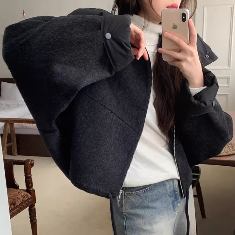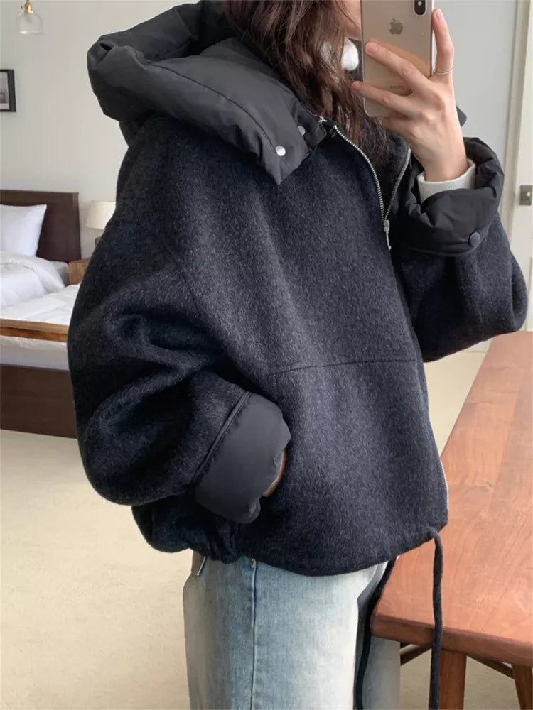 Women's Coffee Brown Woolen Zip-Up Short Jacket with Detachable Hooded Insert offers a versatile and trendy solution for unpredictable weather. This stylish outerwear piece features a rich coffee-colored woolen body paired with a sporty, detachable hooded insert, creating a fashionable layered look without the bulk. Its relaxed, loose fit and convenient zipper closure make it an easy-to-wear staple, perfect for throwing over jeans and sweaters for a chic, laid-back autumn or winter outfit.