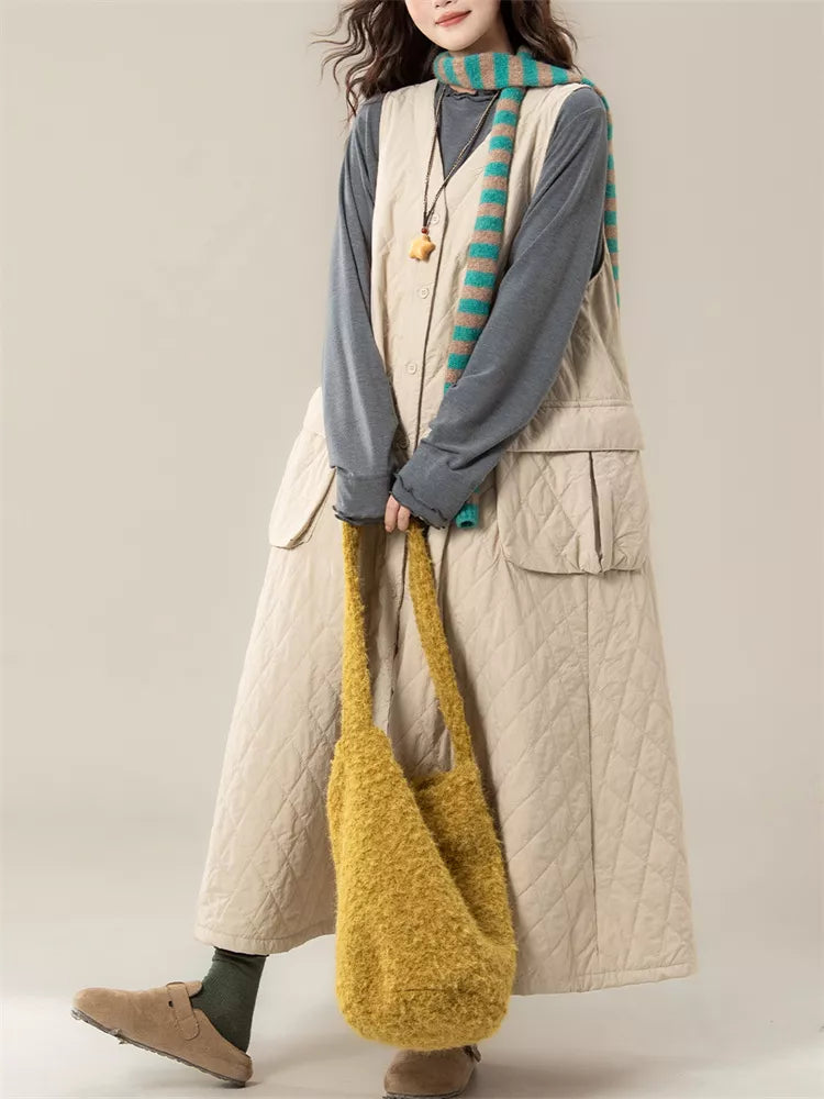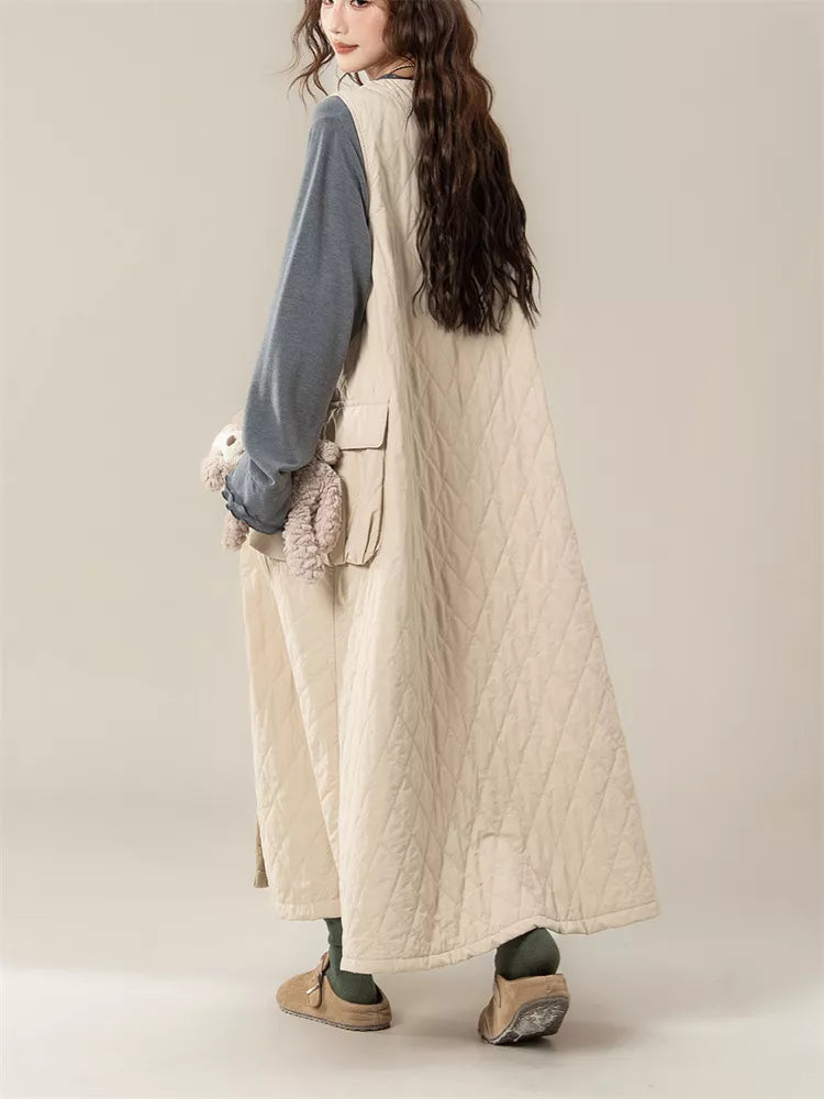 Women's Vintage Beige Diamond Quilted Vest Dress V-Neck Sleeveless Padded Pinafore offers a cozy and stylish layering option for the colder months. Featuring a classic diamond stitched pattern and a relaxed A-line silhouette, this insulated midi dress is designed to keep you warm while maintaining a chic, "Mori girl" aesthetic. With its convenient button-down front and large functional pockets, it pairs effortlessly with long-sleeve tees or knitwear for a comfortable, everyday winter look.