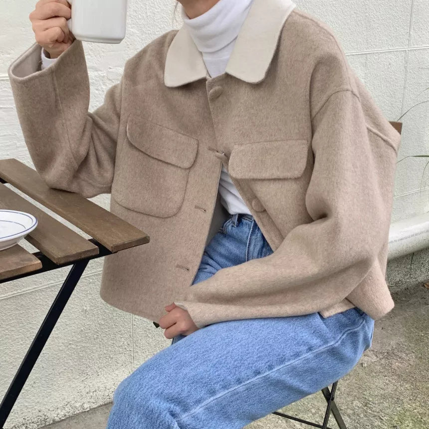 Women's Vintage Grey Woolen Short Jacket with Contrast Cream Collar adds a sweet, retro-inspired touch to your winter outerwear collection. This charming jacket features a soft heathered grey wool-blend fabric accented by a distinct cream-colored collar, creating a stylish contrast. Designed with a relaxed boxy fit, large front patch pockets, and wide sleeves with a "Hand Made" tag detail, it offers a comfortable and trendy silhouette that pairs perfectly with high-waisted jeans or skirts for a youthful, Korean-style look.