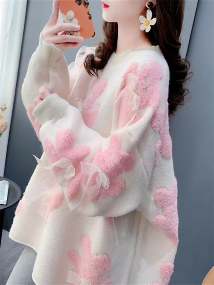 Suéter elegante de cuello redondo con lazo y oso para mujer: prendas de punto cómodas y elegantes