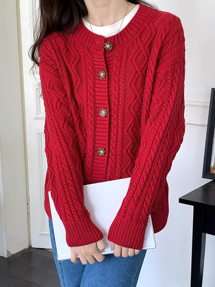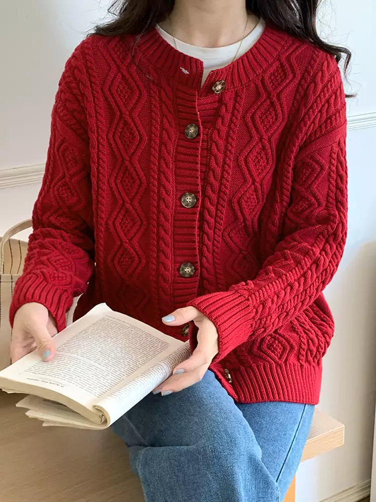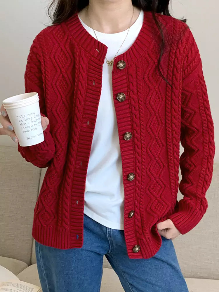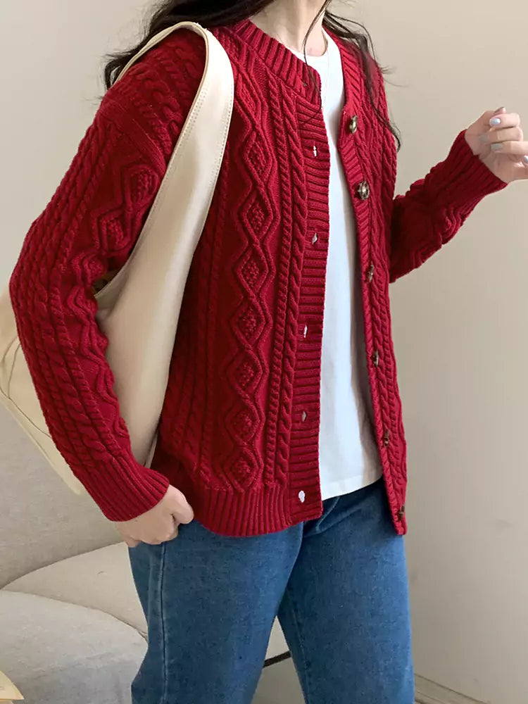 Cárdigan de punto trenzado de algodón para mujer | Chaqueta estilo suéter retro de cuello redondo en rojo vino de corte entallado para otoño e invierno. La prenda de punto vintage 2025 combina la artesanía clásica con la comodidad moderna. Confeccionado en algodón puro, este cárdigan rojo vino presenta un diseño de punto trenzado texturizado y una silueta entallada favorecedora, ideal para usar en capas o como prenda independiente en otoño e invierno. ❤️