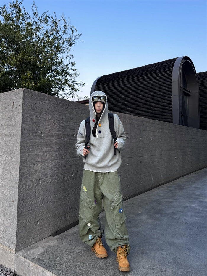 This heavyweight hooded knit sweater features a trendy American streetwear design accented by playful colorful buttons. Its oversized, lazy fit and thick fabric make it an essential cozy piece for autumn and winter layering.