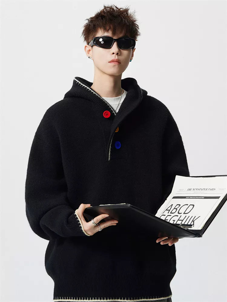 Men's American Retro Heavyweight Hooded Knit Sweater with Colorful Buttons