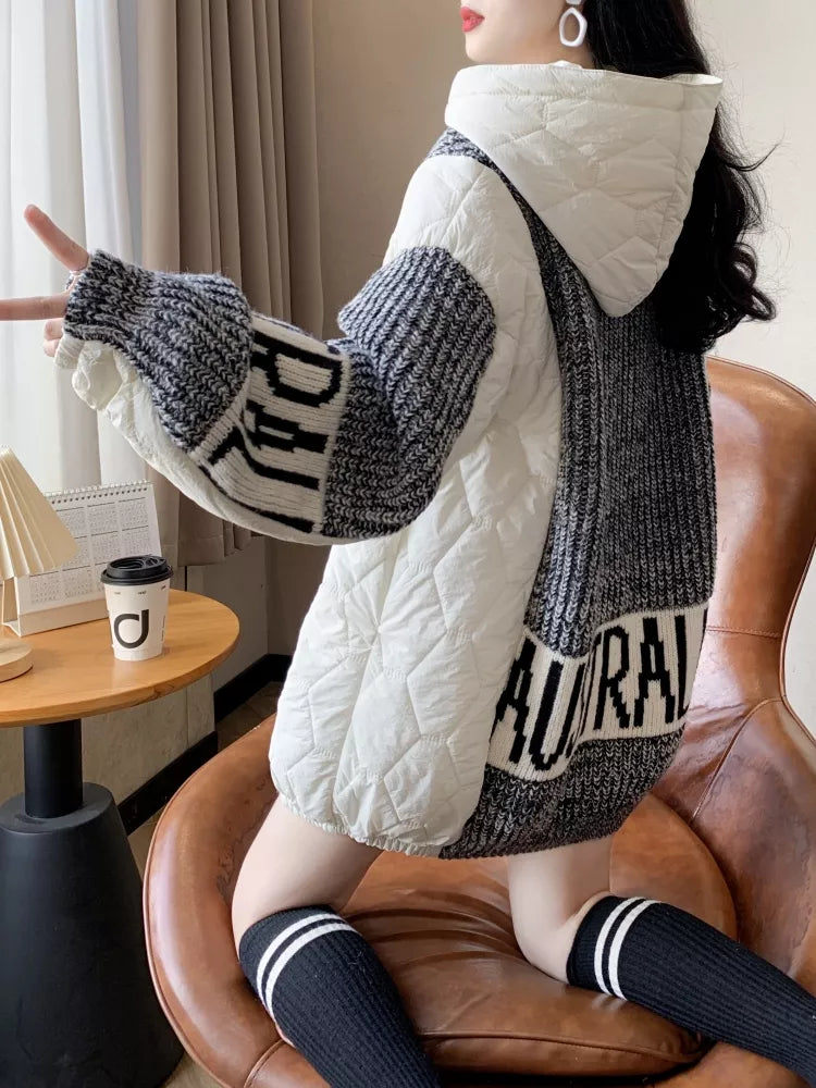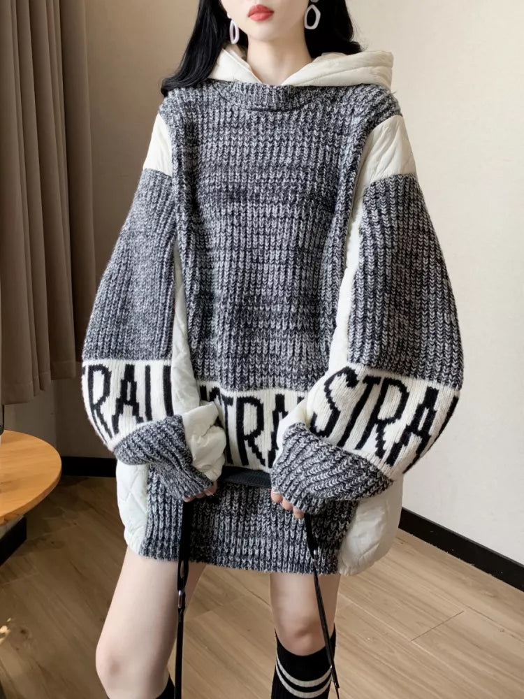 Luce un estilo urbano de moda con esta sudadera oversize con capucha. Presenta un acogedor cuerpo de punto gris jaspeado, mangas acolchadas blancas en contraste y letras gráficas llamativas para un estilo casual que destaca.