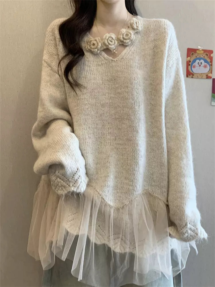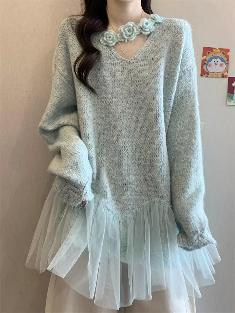 Suéter morado de punto con cuello halter en V para mujer, talla grande, con patchwork de malla floral 3D, combina una elegancia audaz con una comodidad acogedora. Con un diseño de cuello halter en V, un intrincado bordado floral 3D y patchwork de malla transpirable, este suéter oversize es perfecto para looks urbanos impactantes, capas informales o looks elegantes de noche. ❤️