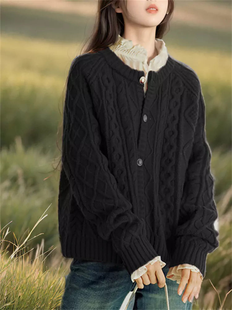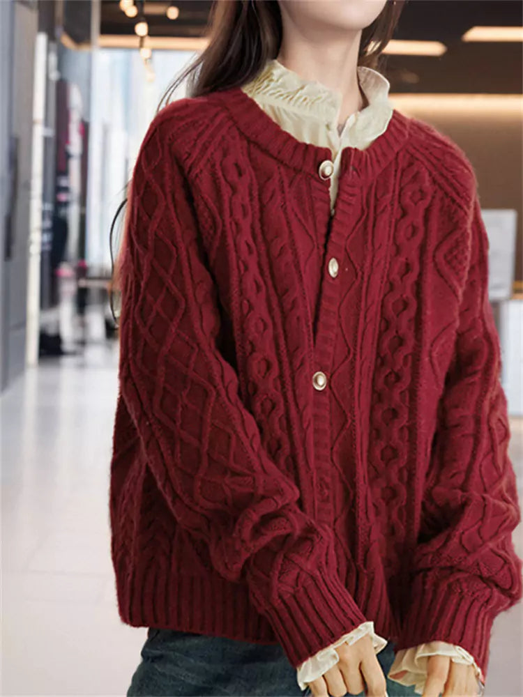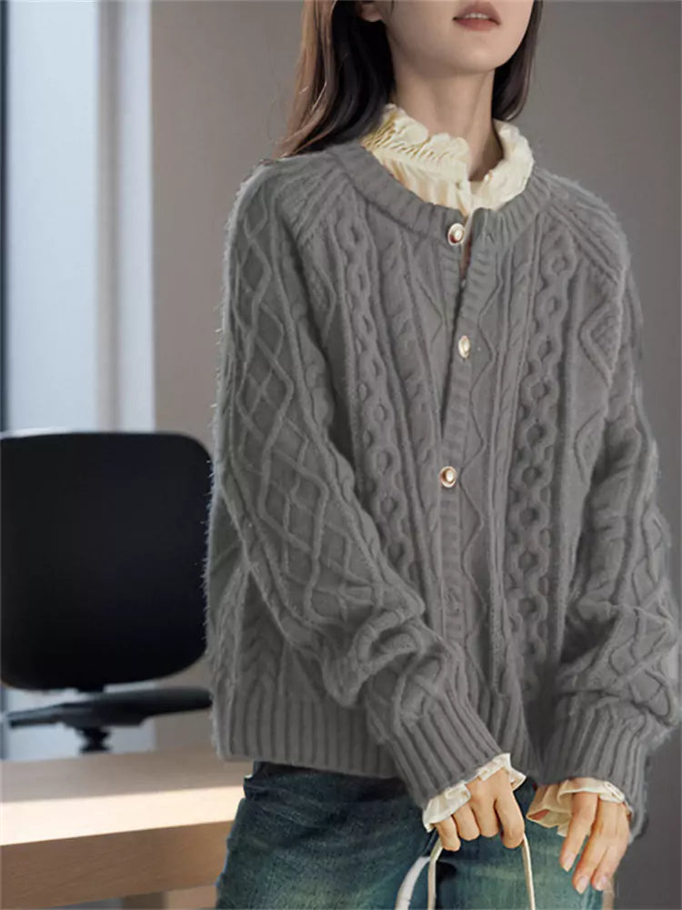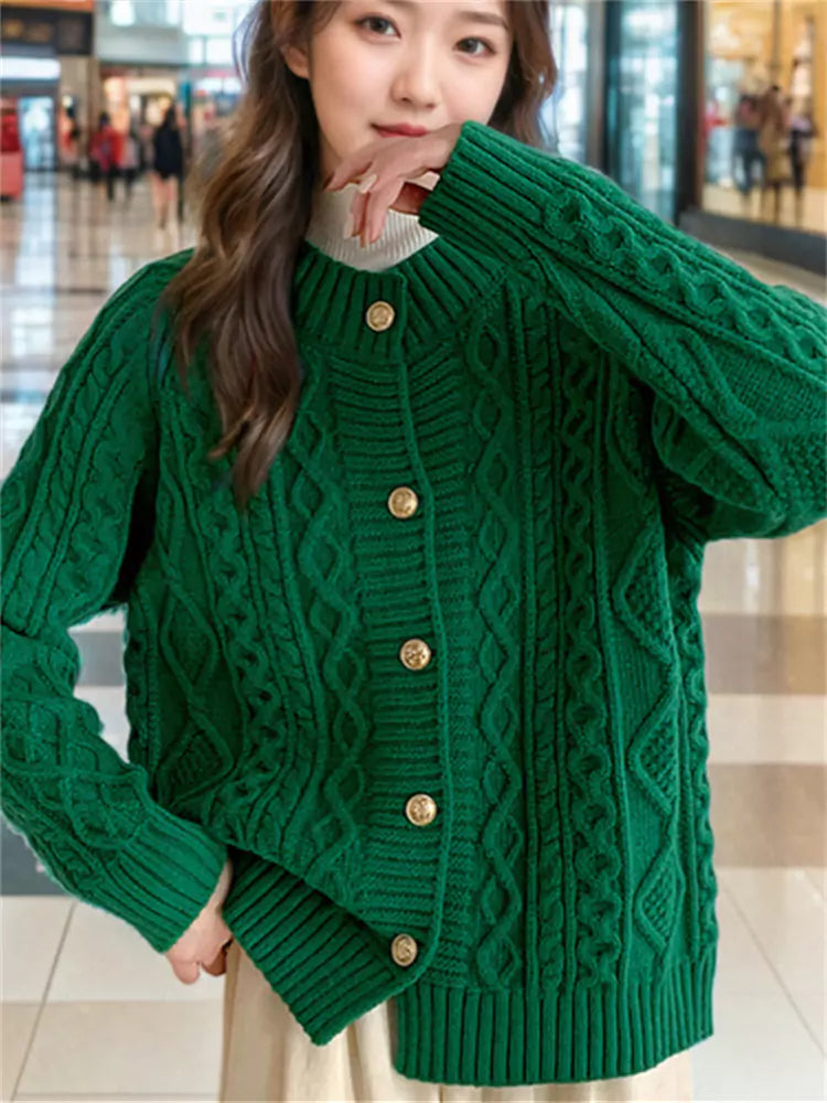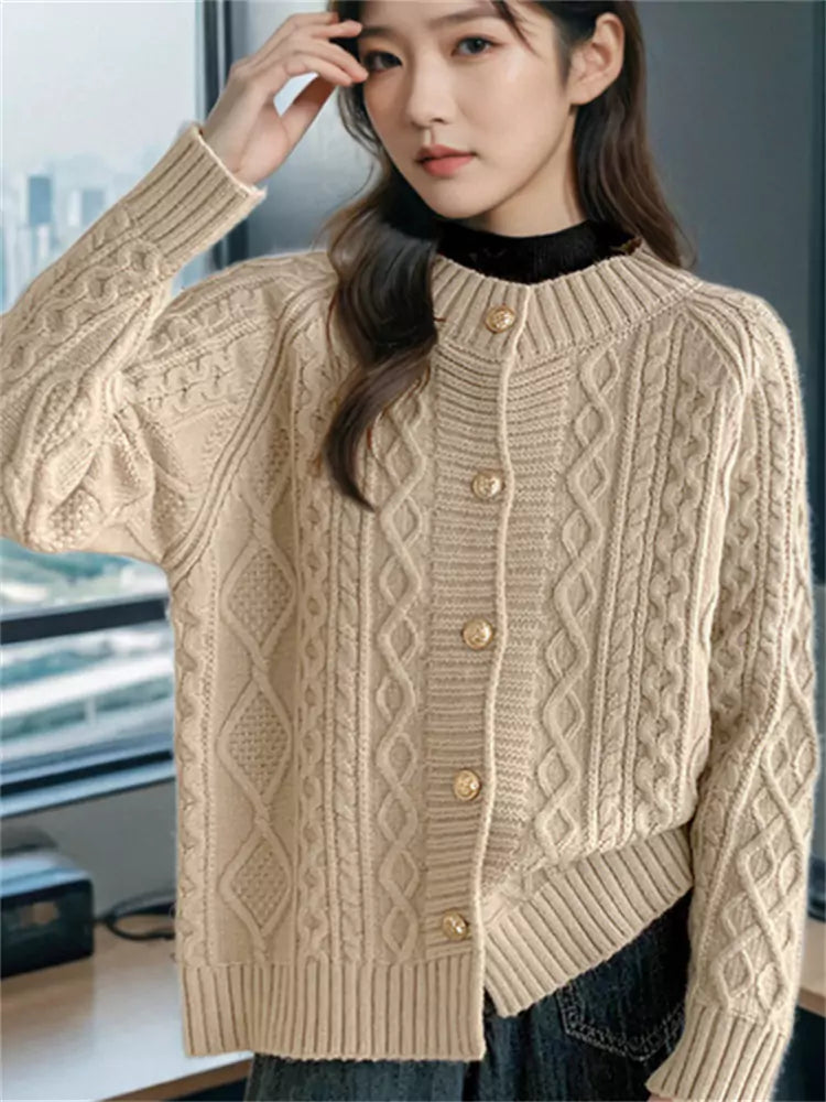 Cárdigan corto de punto grueso con cuello redondo para mujer | Este cárdigan grueso y holgado combina una calidez acogedora con un estilo relajado para el día a día. Confeccionado con hilo grueso y suave, este cárdigan corto presenta un favorecedor cuello redondo, corte holgado y punto grueso texturizado, perfecto para combinar con prendas informales o como una prenda acogedora y llamativa en otoño e invierno. ❤️