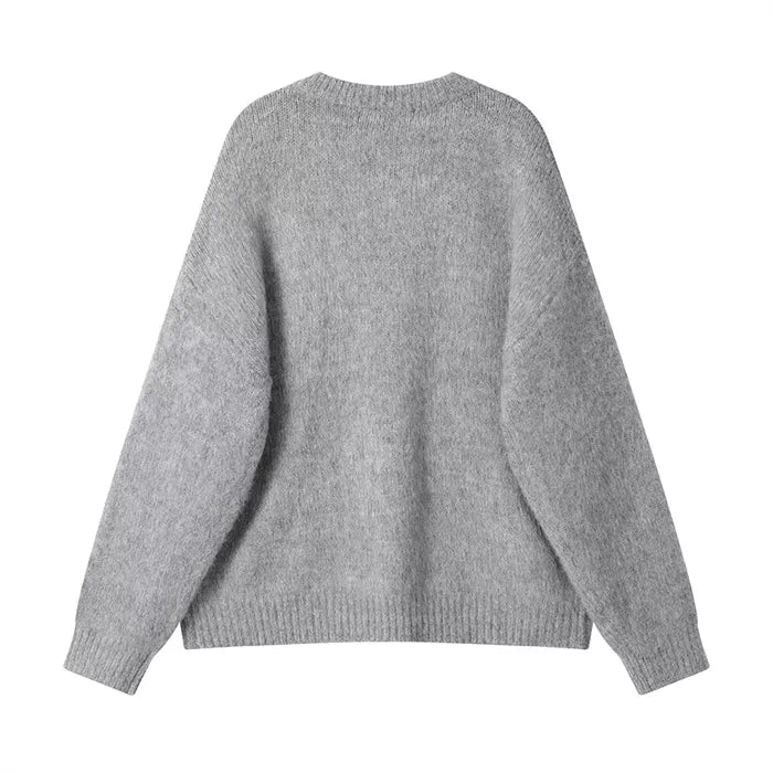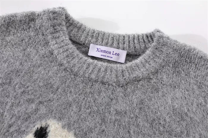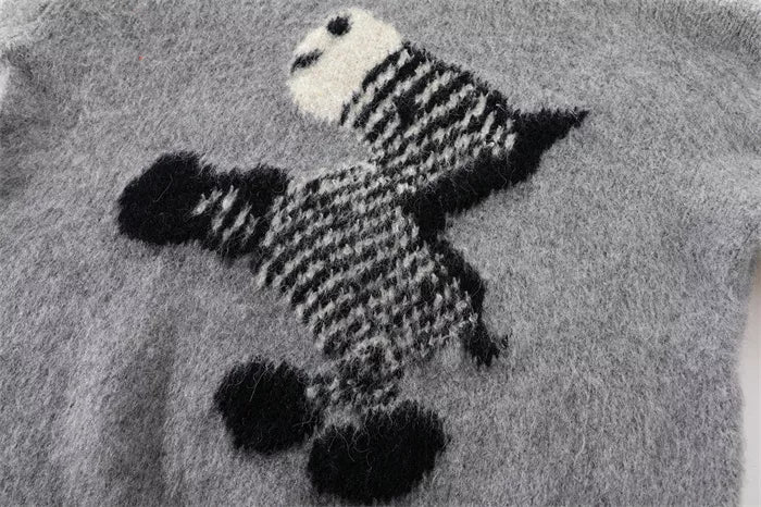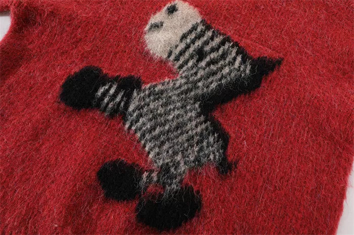 This vibrant red knit sweater features a playful abstract zebra graphic and a cozy, fuzzy texture. Its oversized silhouette and crew neck design make it a perfect statement piece for keeping warm during the winter holidays.