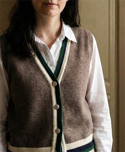 Chaleco de punto con cuello en V y botones para mujer - Cárdigan sin mangas con ribete de rayas estilo preppy