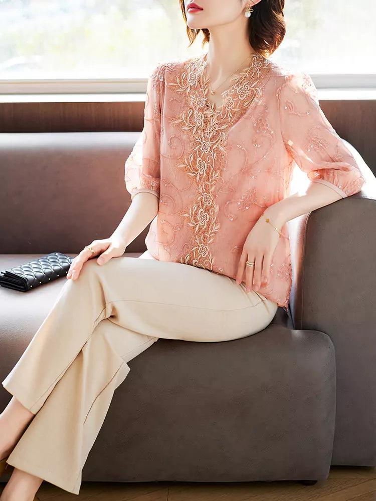 Elegant Half Sleeve Embroidery Lace Floral Chiffon Blouse for Women
