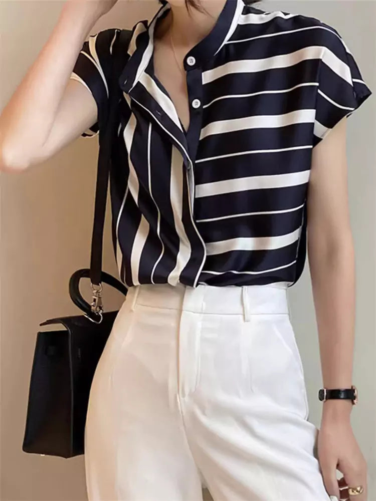 French Style Striped Chiffon Short Sleeve Stand Collar Blouse for Women brings a graceful Parisian charm to your wardrobe. The delicate stripes paired with a chic stand collar and airy chiffon fabric create a lightweight, elegant silhouette perfect for both casual outings and polished looks. A refined piece that enhances your style with subtle sophistication. ❤️