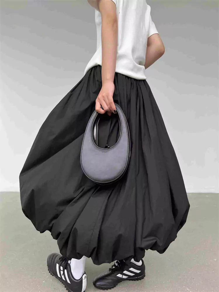 Japanese Style Black Pleated Puff A-Line Midi Skirt for Women