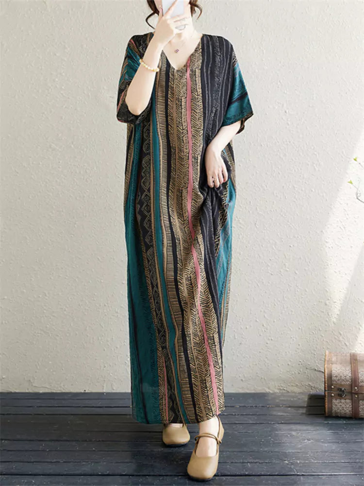 Plus Size V-Neck Vintage Striped Cotton Linen Dress Flattering and Elegant