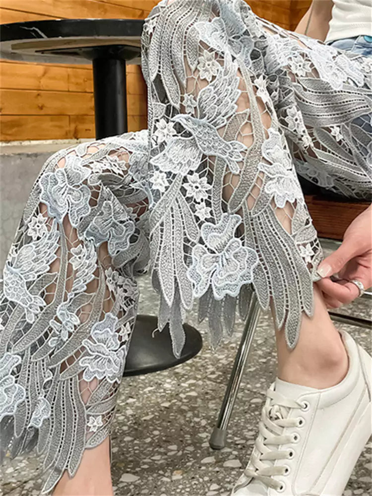 Vintage Straight Leg Denim Pants with Unique Lace Patchwork for Women