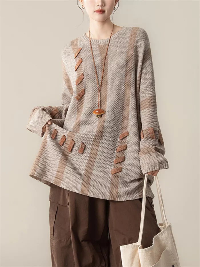 Women's Light Coffee Striped Knit Sweater Artistic Spliced Pullover brings a relaxed, artistic vibe to your everyday wardrobe. This cozy top features a soothing palette of light beige and coffee brown vertical stripes, uniquely interrupted by textured "patch" stitching details for a deconstructed, vintage look. Designed with a classic round neckline and a comfortable loose fit, this soft knit sweater is perfect for layering and achieving that effortless "Mori Girl" or casual chic aesthetic.