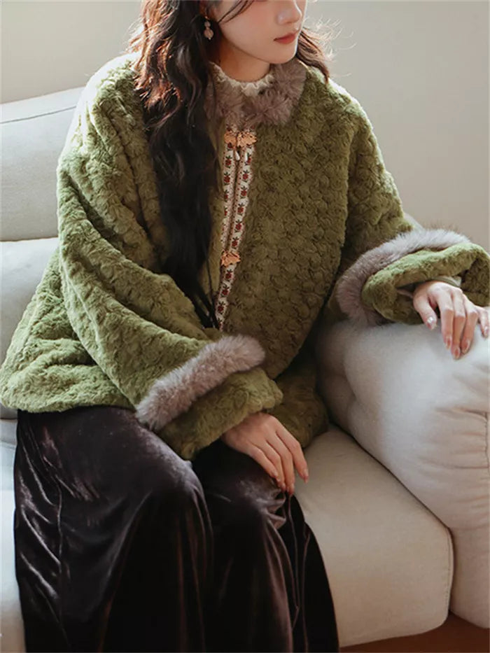 Women's Vintage Green Faux Fur Jacket Chinese Style Plush Coat with Butterfly Clasps exudes a luxurious and artistic charm. This exquisite coat is crafted from a textured, moss-green plush fabric that mimics the softness of lambswool. It features a stunning central placket trimmed with delicate floral embroidery and fastened with unique golden butterfly clasps. Finished with rich brown faux fur accents on the collar and cuffs, this warm jacket perfectly blends retro Chinese aesthetics with modern elegance, making it a standout piece for your winter wardrobe.